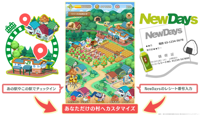 ゲームへの日々のログイン以外にも、JR東日本の各駅でのチェックインや、NewDaysでお買い物した際のレシート記載番号を入力することで、ゲーム内で使用できる限定チケットが手に入り、あなただけの村へカスタマイズして楽しむことができます。