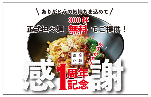 正式担々麺 進辛正麺が開店より1周年を迎えました。1周年を記念して、300杯無料でご提供!