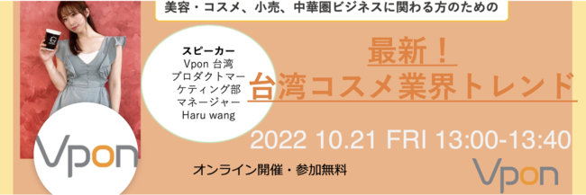 アジアのビッグデータカンパニー Vpon JAPAN株式会社(本社:東京都新宿区、代表取締役社長:篠原 好孝(以下、Vpon))は2022年10月21日(金)、美容・コスメ業界、小売業界を対象に、台湾コスメのトレンドや最新マーケティング手法を紹介する「台湾コスメトレンドウェビナー」を開催します。