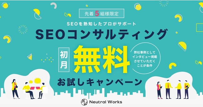 株式会社ニュートラルワークス(神奈川県茅ヶ崎市、代表取締役:三木五月/以下 ニュートラルワークス)は2022年10月20日(木)より、「SEOコンサルティング」のお試しキャンペーンを実施します。インタビュー掲載にご協力いただける先着5組の企業様に、通常300,000円~(税別)の本サービスを初月無料にてご提供します。
