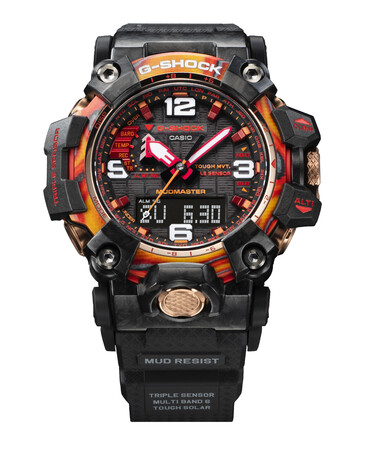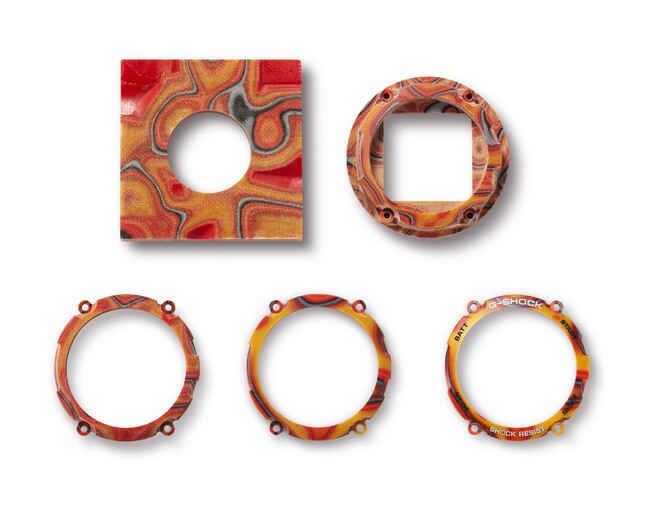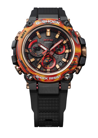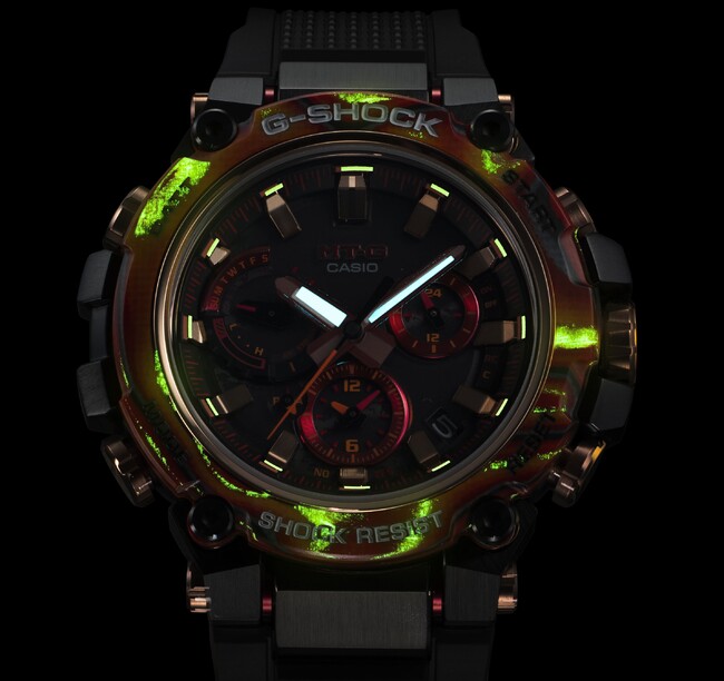 40周年記念モデル第一弾の『Flare Red MTG-B3000FR/GWG-2040FR』は、“G-SHOCK”ブランドを象徴する赤を強力なエネルギーで発生する太陽フレアに見立て、蓄光素材を用いたマーブル模様の積層ベゼルを採用した耐衝撃ウオッチです。カラーグラスファイバーのシートとカーボンのシートを幾層にも積み重ねてからベゼルの形に削り出す新しい手法で成形しました。グラスファイバーのシートに蓄光粒子を混ぜることで、暗闇でも力強く存在感を放ちます。また、ベゼルを削り出す場所により層の見え方が異なるため、一点ごとに固有の風合いを楽しめます。さらに、文字板にも太陽フレアをイメージした模様をクリア印刷で施し、躍動感あるフェイスデザインに仕上げています。