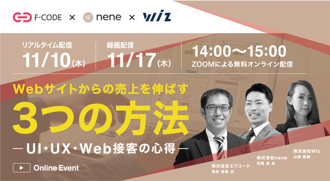 11月10日(木)、11月17日(木)※、株式会社Wizは、【株式会社エフコード 取締役 荒井裕希氏】をお迎えして、「Webサイトからの売上を伸ばす3つの方法」についてお伝えするウェビナーを開催します。