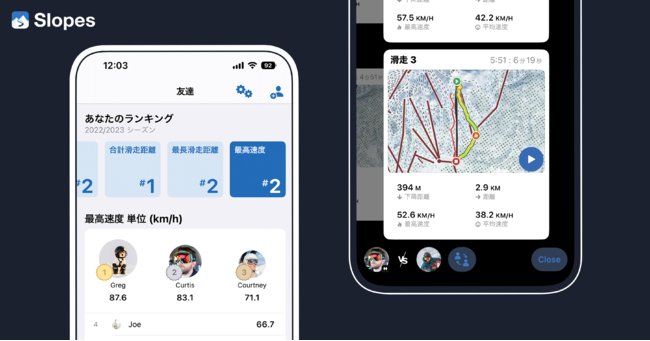 友達を追加すると、スキー場で過ごした日数、合計垂直距離、最長垂直距離、滑走数、時間、合計距離、最長滑走距離、最高速度などのさまざまなランキングで比較したり、友達と一緒に滑ったコースを3Dマップ上で振り返ったりすることが可能になります。