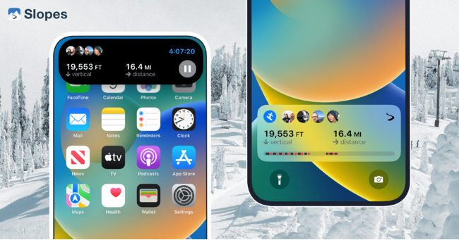 Slopesは、AppleがiOS 16.1で提供予定の新機能「ライブアクティビティ」に対応しています。ロック画面からリアルタイムの滑走記録を確認できるほか、記録の開始/一時停止の操作が可能になります。iPhone14 Pro / Pro Maxをご使用の方は、同機種で登場した機能、「ダイナミックアイランド」でもライブアクティビティをご利用いただけます。