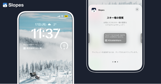 Slopesは、iOS16で登場したロック画面にウィジェットを追加できる機能に対応しました。また、Apple Watchの文字盤にもSlopesのウィジェットを表示できるようになります。お気に入りのスキー場の雪予報や雪質など、スキーヤー&スノーボーダーにとって必要な情報をひと目で確認することが可能になりました。また、ホーム画面には雪山で撮影した写真を表示したり、週間雪予報をチェックできるウィジェットを表示できます。