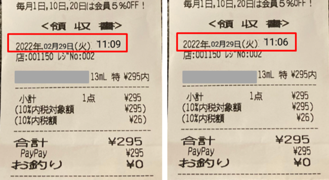 【1】購入日時を加工し、同じレシートを使いまわしているケース
