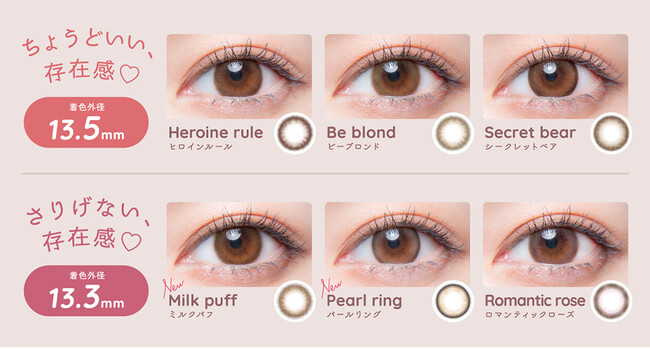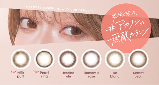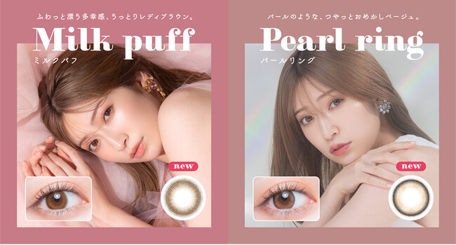 既にご好評いただいている4カラーに加え、ふわっとしたデザインで女性らしさを引き出すブラウンカラーのMilk puff(ミルクパフ)、細めくっきりフチに瞳と馴染みやすくデザインされたトレンドライクなベージュカラーのPearl ring(パールリング)の2色が新たに加わりました。