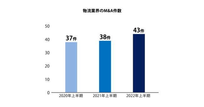 2020年、2021年、2022年の上半期において、上場企業によるM&A案件のうち、物流業界を対象としたM&A件数を調査した結果、2020年は37件、2021年は38件、2022年は43件でした。背景には少子高齢化によるドライバー不足、それによる人件費の高騰、原油価格の高騰、2024年問題などがあると考えられます。