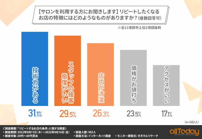 【株式会社オールトゥデイ|調査レポート】リピートしたいサロンは◯◯が高いところと判明!また更にリピーターを獲得するために取り組むべきことは?