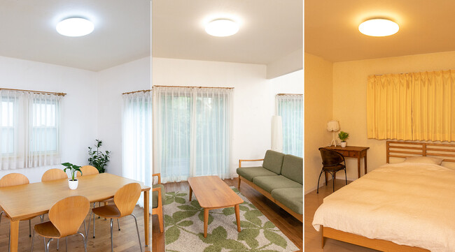 本シリーズは、すべての製品が7段階に調光(明るさの調整)可能。また、調光・調色シーリングライトでは、昼光色から電球色まで調色も7段階で、さらにリモコンに3つのシーンボタンを搭載。「仕事」「家事」「くつろぎ」それぞれのシーンに合わせて適した明るさと色に調整します。