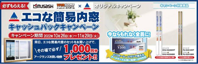「エコな簡易内窓」キャッシュバックキャンペーンでは、キャンペーン期間中に対象となる「エコな簡易内窓」をご購入のお客様に ビバホーム、ムサシで使える1,000円分のお買い物券をその場でプレゼントいたします。