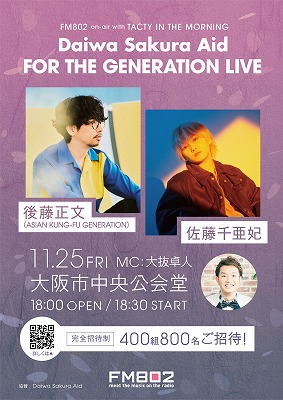 毎週月曜日~木曜日 朝6時からオンエア中の「on-air with TACTY IN THE MORNING」。この度、大阪市中央公会堂にて「FM802 on-air with TACTY IN THE MORNING Daiwa Sakura Aid FOR THE GENERATION LIVE」の開催が決定!出演は後藤正文(ASIAN KUNG-FU GENERATION)と佐藤千亜妃。