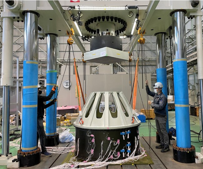 ZEROは、宇宙到達実績のある観測ロケット「MOMO」に続くロケットとしてインターステラテクノロジズが開発を本格化させている、超小型人工衛星用の小型ロケット(長さ25m、直径1.7m、総重量33t)です。ZEROの機体胴体には、軽量で成形性のよいアルミのコア材をCFRP(炭素繊維強化プラスチック)で挟むサンドイッチ構造を採用。本試験では、実機と同じ直径1.7mサイズのEM2種を製造し、打上げの負荷に耐えうる強度と剛性(変形のしにくさ)を有しているか、設計の妥当性を確認しました。