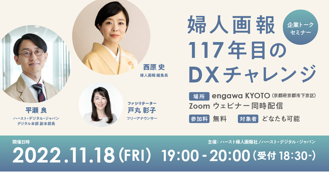 株式会社ハースト婦人画報社(本社:東京都港区、代表取締役社長:ニコラ・フロケ)は、2022年11月18日(金)19:00より京都市四条のサテライトオフィス「engawa KYOTO」にて、「婦人画報117年目のDXチャレンジ」をテーマにトークセミナーを開催いたします。また、本セミナーはZoomウェビナーで同時配信します。