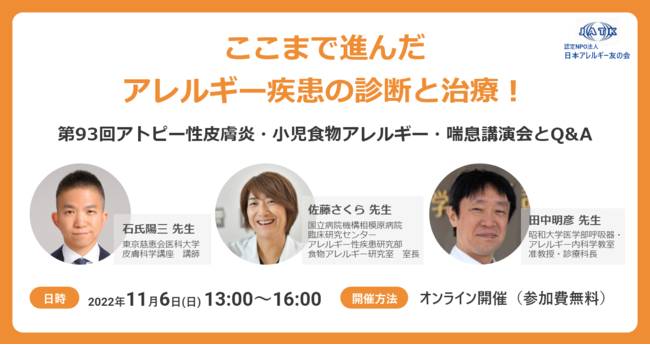 認定NPO法人日本アレルギー友の会(所在地:東京都江東区、理事長:武川篤之)は、アレルギー疾患のそれぞれの領域の専門の先生方より既存の治療から最新の薬を用いた治療までをわかりやすく説明いただく講演会を11月6日に開催いたします。11月4日まで申し込みを受け付けています(先着500名)。進化している最新治療について理解する機会として是非ご活用ください。