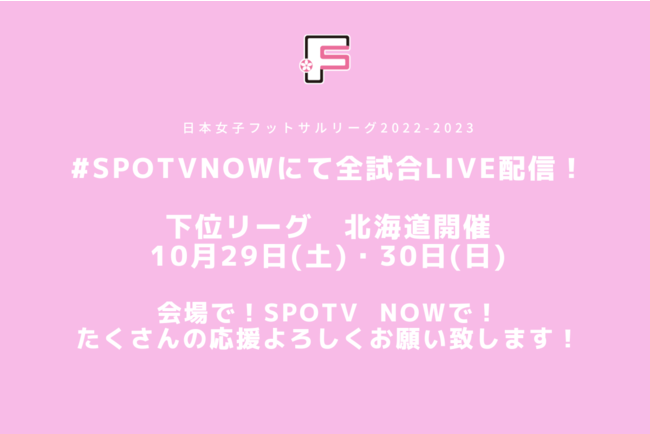 10月29日(日)・30日(日)に、函館アリーナにて日本女子フットサルリーグ2022-2023 下位リーグの2試合を開催します。今シーズンもSPOTV NOW(登録・視聴無料)にて全試合をライブ配信いたしますので、ぜひご視聴ください!