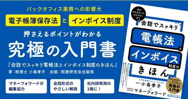 株式会社マネーフォワードは、税理士小島孝子先生の著書『会話でスッキリ 電帳法とインボイス制度のきほん』に編集協力を行いました。この度、本書が株式会社税務研究会出版局より、10月31日(月)から販売されることをお知らせいたします。
