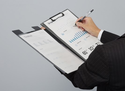 そこで今回、そのような声にお応えして、ビジネスシーンにも使いやすいブラックカラーをラインアップに追加しました。“3段のインデックスポケットで分類しやすい“、”1枚目のインデックスポケットが透明で、左右に書類を並べて記入できる“、”厚めのボードで立ち作業でも書きやすい“などの好評な機能はそのままに、幅広いシーンで活用できるカラーを採用しました。