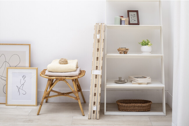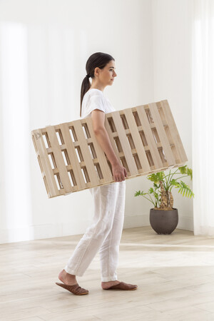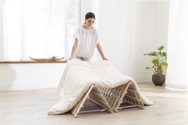 3.すのこの厚みや素材、構造の細部までこだわり、強度アップを図った頑丈設計により、静止耐荷重も200kgまで耐えうる優れた耐久性を実現。さらに女性やお年寄りでもさっと敷けて、ラクに運べる重さ5.6kgという軽量設計。使わない時は四つ折りに畳めば46×97×10cmとスリムに収納可能。4つ折りに畳んだ状態で固定するのに便利な、マジックテープ付きです。