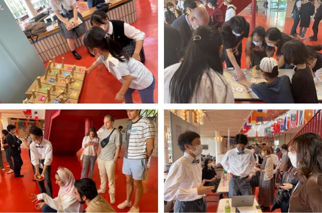 当日は子どもから大人まで多くの来場者に恵まれ、来場者の言語に合わせて日英でプロジェクトの発表を行いました。また、SDGsの意義をもっと多くの人に知ってもらうためにグループ毎に作成したゲームは「輪投げ」や「かるた」など日本文化を織り交ぜたゲームもあり、来場者が本校生徒と共に楽しみながらSDGsについて学ぶ様子が見られました。さらに、同会場内で行われた大学生主催「純喫茶」とのコラボレーションとして、純喫茶で提供された水、コーヒー、紅茶、オレンジジュースにまつわる「自宅でできる環境改善案」をカードにして配布しました。