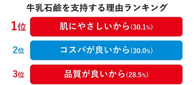 牛乳石鹸を好きな理由や使い始めたきっかけなど、支持する理由を尋ねたところ、「肌にやさしいから」が30.1%で最多、ついで「コスパが良いから(30.0%)」「品質が良いから(28.5%)」の順に多いことが分かり、高品質かつコストパフォーマンスが良いイメージを持つ人が多い傾向にあることが判明しました。発売当時から守ってきた”やさしさへのこだわり“が支持される理由に繋がっていることが分かります。