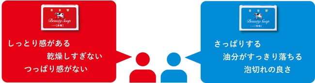 赤箱派、青箱派それぞれの洗顔料やボディーソープのこだわりとして、赤箱派は「しっとり感がある」「乾燥しすぎない」などしっとり感を求める声が多いことが分かりました。一方、青箱派は「さっぱりする」「泡切れの良さ」などさっぱり感を求める声が多い傾向に。カウブランド赤箱・青箱は、それぞれのニーズをしっかりと汲み取っていることが分かります。