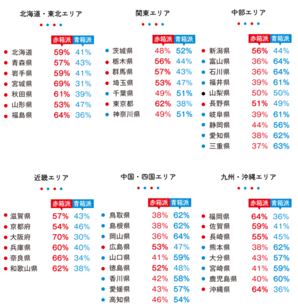 都道府県別では東北や甲信越、関西は赤箱派、東海や中四国・南九州は青箱派の傾向。地域性による違いが判明。