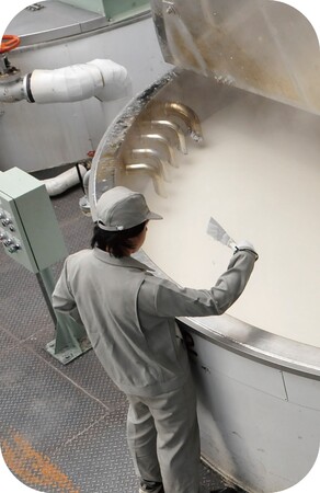 ●国内最大級の設備!ロングセラーを支える「釜だき製法(けん化塩析法)」