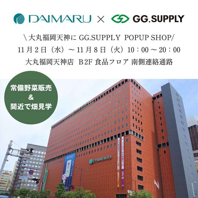 野菜の生産・販売事業を展開する、GG.SUPPLY株式会社 (本社:福岡県中央区、代表取締役:國村 隼太)の運営する、都会のHATAKE『GG.SUPPLY(ジージーサプライ)』は、2022年11月2日(火)~11月8日(水)大丸福岡天神へPOPUP出店致します。