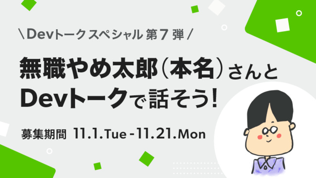 株式会社エイチームのグループ会社であるQiita株式会社(本社:名古屋市中村区、代表取締役社長:柴田健介)が運営する「Qiita Jobs」は、エンジニアが特定のテーマを軸にマッチングし、知識共有や交流ができる機能「Devトーク」の特別企画として、関西弁かつ会話形式のQiita記事が大人気の無職やめ太郎(本名)氏と話せる「Devトークスペシャル」の募集を、11月1日(火)より開始しました。