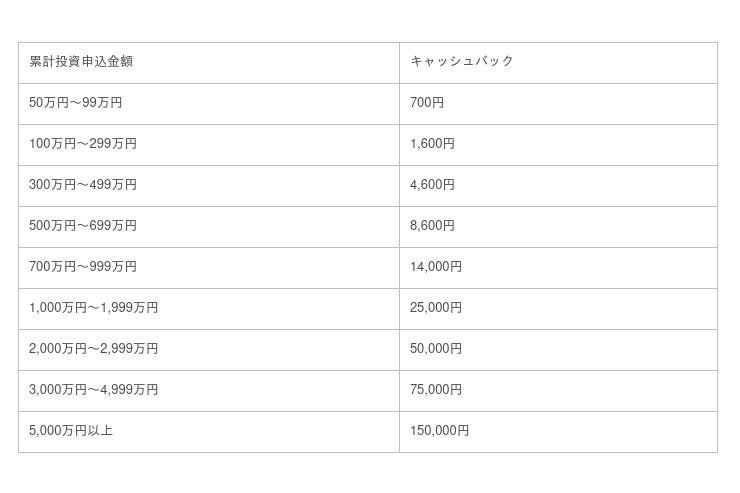期間中の累計投資申込金額に応じて下記の金額をキャッシュバックします。