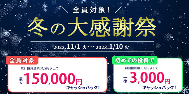 個人投資家の皆様にさまざまな投資機会を提供するオルタナティブ投資プラットフォーム「SAMURAI FUND」を運営するSAMURAI 証券株式会社(本社:東京都港区、代表取締役社長:山口 慶一)は、2022年11月1日(火)から2023年1月10日(火)まで、SAMURAI FUNDでご投資されたすべてのお客様向けに、投資申込金額に応じてキャッシュバックをする『全員対象!冬の大感謝祭』を実施いたします。