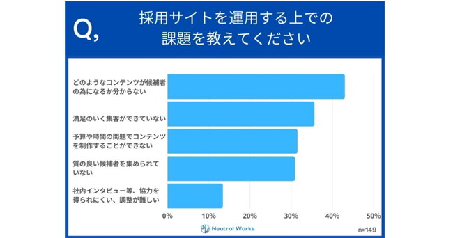 デジタルマーケティング支援をしている株式会社ニュートラルワークス(神奈川県茅ヶ崎市 代表取締役:三木五月、以下「ニュートラルワークス」)は、採用サイトを運営する企業に所属する男女149名を対象に、「自社採用サイト運用への取り組み」に関する意識調査を行いました。