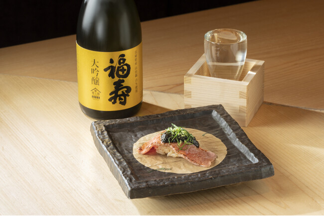 今回は海と山に面し、独特で多様な食文化が醸成されてきた食の都・神戸市とのコラボレーション。当店は、最高級の牛肉として名高い神戸ビーフのサーロインを使用し、ミシュラン一つ星の「薪焼 銀座おのでら」シェフ・寺田 惠一(てらだ けいいち)が監修した「炙り神戸ビーフの握り~薪薫る海苔ソース」(税込620円)を期間・数量限定で提供いたします。さらに全国有数の酒どころである灘五郷の一つ・御影郷でつくられた日本酒「福寿大吟醸」(180ml/税込1,830円)も併せてご用意しております。