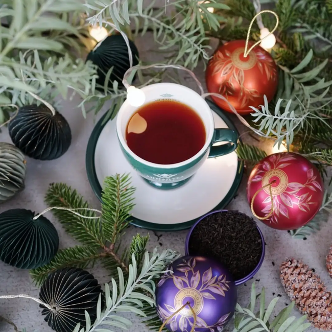 2022年のクリスマス限定デザインは英国王立植物園「キューガーデンス」とのコラボデザインが実現しました。ボタニカルをコンセプトにしたデザインの丸型の缶は、オーナメントとしてクリスマスツリーに飾って楽しむことができます。缶の中にはアーマッドティーの誇る本格リーフティーが入っています(アルミ内袋付)。