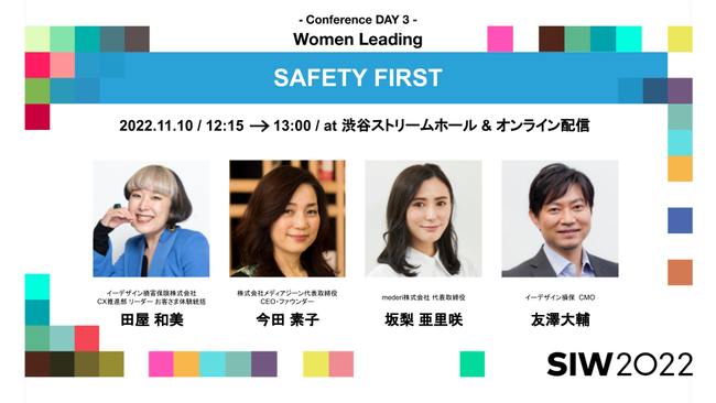 11月10日(木)には、渋谷ストリームホールにて、メデリピル(mederi Pill)のブース出展、並びにmederi 代表取締役 坂梨 亜里咲が、「SAFETY FIRST 安全な社会って一体どう作るの?」というテーマでトークイベントに登壇いたします。