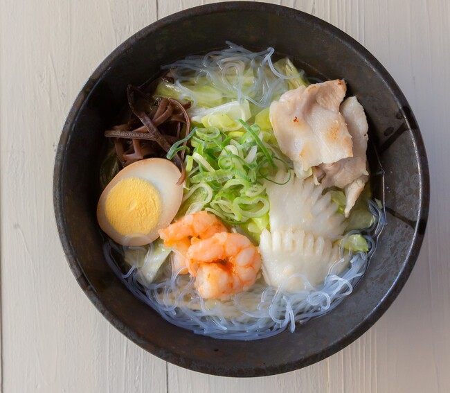 あっさり優しい鶏ガラスープをベースに、エビ、イカ、たっぷりの野菜とツルっとした喉ごしの春雨を使っています。春雨は、弊社の商品を使用。ボリューム感のある具だくさん春雨スープに仕上げました。