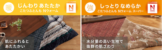 こたつ布団の多数のラインナップに、大人気の吸湿発熱素材Nウォーム機能が加わり、さらにあたたかくなりました。