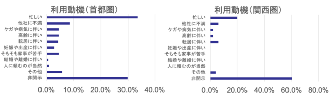 利用動機では首都圏では単身で多忙(12.5%)が、関西圏では共働きで多忙(12.5%)が1位に