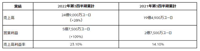 第1~第3四半期の累計販売台数は前年同期比3%増の 11,316台、売上高は前年同期の19.49億ユーロから28%伸びて24.90億ユーロでした。