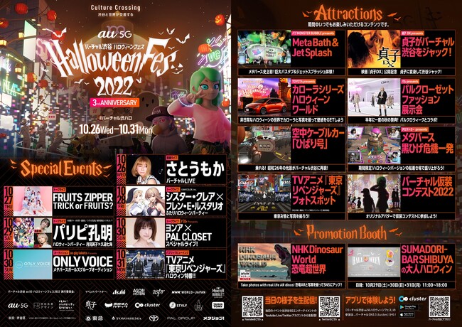 バーチャル渋谷ハロウィーン実行委員会(KDDI株式会社、一般社団法人渋谷未来デザイン、一般財団法人渋谷区観光協会)は、「バーチャル渋谷 au 5G ハロウィーンフェス 2022」(以下、バーチャルハロウィーン)を、渋谷区公認配信プラットフォーム「バーチャル渋谷」内で、10月26日(水)から31日(月)まで開催しました。3年目の開催となる今年は、「Culture Crossing - 渋谷と世界が交差する -」というテーマを掲げ、賛同したパートナー16社と共に、日本のポップカルチャーとテクノロジーを融合させた新たなエンターテイメントを渋谷から世界へ発信しました。