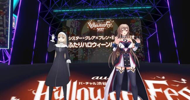 バーチャルライバーグループ・にじさんじから、昨年に続き2度目の参加のシスター・クレアと今年初登場のフレン・E・ルスタリオの2人が登場。Q&Aのコーナーではフレンは自身が挑戦してみたいコスプレとして「チャイナドレス」と発表、会場からは「絶対に合う!!」「見てみた過ぎる!」とコメントが寄せられました。そして、「Vハロコス2022」の途中経過も発表、会場にいるアバターへも「ものすごく可愛い子がいますね」など様々な感想を述べました。会場を駆け回ったり、手を振ったりと、普段では絶対ありえない距離感での二人との交流にファンは終始大興奮となりました。