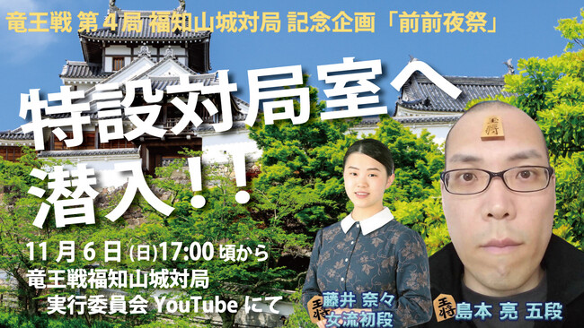 竜王戦福知山城対局 記念企画「前前夜祭」藤井竜王と広瀬八段が11月8・9日に対局する特設対局室をYouTubeライブで先行公開! 11/6(日)17:00頃~ 島本亮五段と藤井奈々女流初段が潜入!!