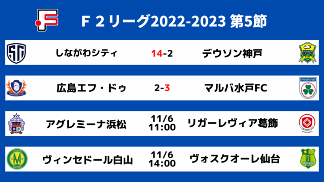 延期となっていた第5節の2試合を11月6日に開催!6位のアグレミーナ浜松と5位のリガーレヴィア葛飾は勝点3。今節の結果によっては順位が入れ替わる可能性もあり、どちらにとっても勝たなくてはならない一戦です。第2試合では7位のヴィンセドール白山と3位のヴォスクオーレ仙台が対戦。本拠地開催の白山は、ホームの観客の前で勝利を目指します。仙台は今節の結果によっては2位に浮上する大切な一戦。混戦模様のF2リーグはどの試合からも目が離せません。熱戦の模様は会場で、ELEVENのライブ配信で、お楽しみください!