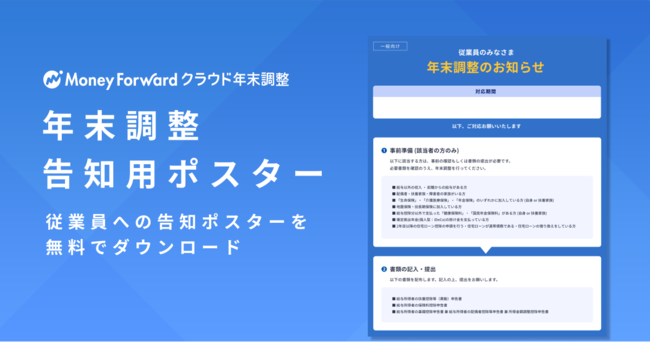 株式会社マネーフォワードは、年末調整の書類配布と回収について、従業員に向けて告知できるポスターのテンプレートを公開しました。