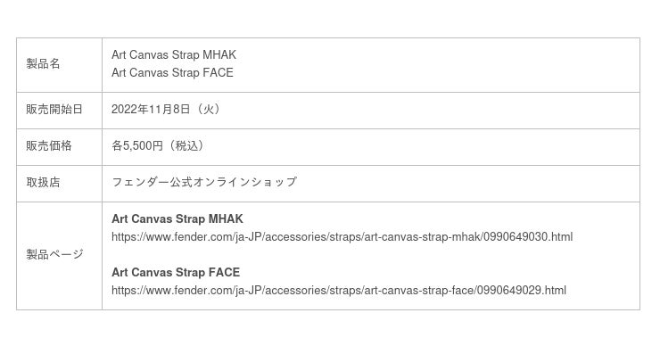 フェンダーミュージック株式会社(所在地:東京都渋谷区、代表取締役社長アジアパシフィック統括 エドワード・コール)は、”プレイヤー達が自分自身を表現できるように”というコンセプトのもと展開する“Art Canvas シリーズ”に、国内のグラフィックアーティスト”MHAK | MASAHIRO AKUTAGAWA”と”FACE”がそれぞれデザインしたストラップ『Art Canvas Strap MAHK』および『Art Canvas Strap FACE』”2種を発表し、2022年11月8日(火)より日本フェンダー公式オンラインショップにて販売を開始します。