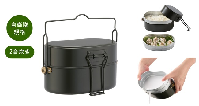 自衛隊規格の金型で製造しているため安心の品質で、アウトドア調理の際に大活躍します。深めのなかごには蒸し料理や湯切りをするための穴を設けており、パスタ料理や米とぎにも最適で、その他様々な調理に対応します。なかごはお皿として使えることはもちろん、本体でごはんを炊きながら、なかごで別のおかずを同時に調理することもできるので、時間短縮にもつながります。