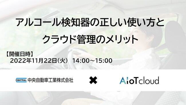 アルコールチェック管理サービス『スリーゼロ』(https://alc.aiotcloud.co.jp/ )を提供する株式会社AIoTクラウド(本社:東京都江東区、代表取締役社長:石黒 豊)は、業務用アルコール検知器トップシェアの「ソシアック」シリーズを販売する中央自動車工業株式会社(本社:大阪市北区 代表取締役社長:坂田 信一郎)と共催ウェビナー「アルコール検知器の正しい使い方とクラウド管理のメリット」を11月22日(火)に開催いたします。