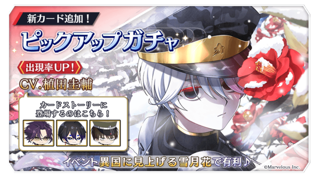 株式会社マーベラス(代表取締役社長:佐藤 澄宣/所在地:東京都品川区)による、スマートフォンゲーム『千銃士:Rhodoknight』(読み:せんじゅうし ろーどないと 以降、『千銃士R』)は、11月3日より開催中のイベント「異国に見上げる雪月花」にあわせて、イベント内で活躍する★3「【紅椿と白皙】在坂(CV:植田圭輔)」の新カードがピックアップで登場する期間限定ガチャを開催いたします。