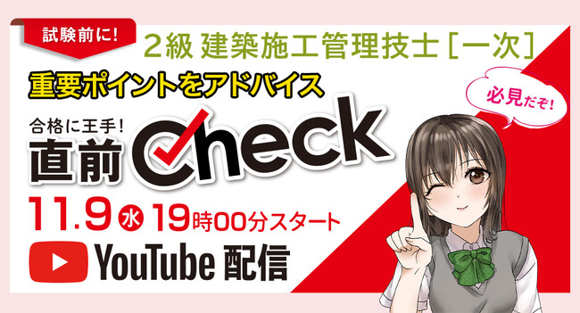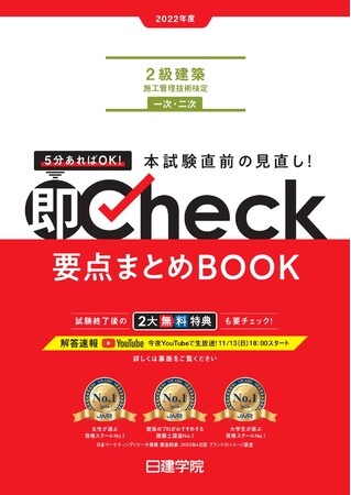 2022年11月13日(日)に実施される2022年度 2級建築施工管理技士 一次検定の試験直前アドバイスを2022年11月9日(水)19:00よりYouTube配信いたします。ぜひ日建学院ホームページにて要点まとめBOOKをダウンロードの上、直前Checkで最終確認しましょう。